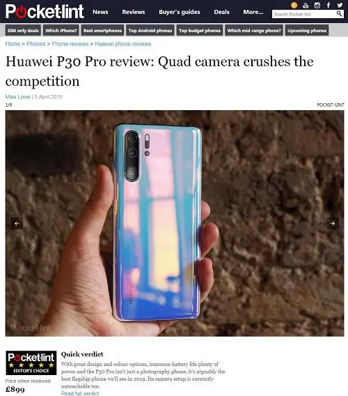 就在4月5日,英国最大的独立产品评测网站Pocket-lint发布了华为P30 Pro评测。在标题处,他们写了一句“Quad Camera Crushes the competition”(四颗摄像头打败了所有竞争对手),瞬间吊足了全球网友的胃口。而这篇评测也是截至目前,外媒对华为P30 Pro撰写过的最详细评测。