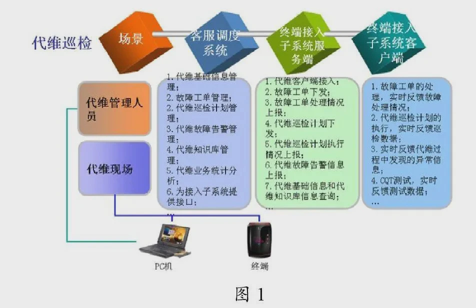 从提高工作效率角度,代维信息化系统需要对客服调度系统、故障派单系统、网管系统、动力系统以及传输等系统进行整合并统筹开发,结合现状,规划对客服调度系统进行改造作为代维业务的管理平台,实现对故障工单的流转和代维巡检计划的管理等功能,满足代维巡检管理平台的相关需求;同时提出新建终端接入子系统(即终端接入部分)作为客服调度系统的现场延伸部分,将代维延伸至代维现场,实现代维工作的现场化、移动化。