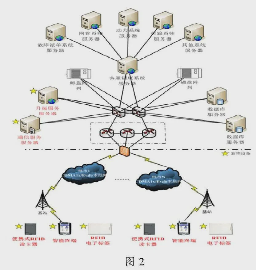 本方案建议中国电信四川省分公司为每个需要的代维巡检人员配备一台具备RFID扫描功能的智能手机,作为终端接入子系统客户端的运行载体,代维巡检人员携带该智能手机到现场完成故障处理、巡检等任务。