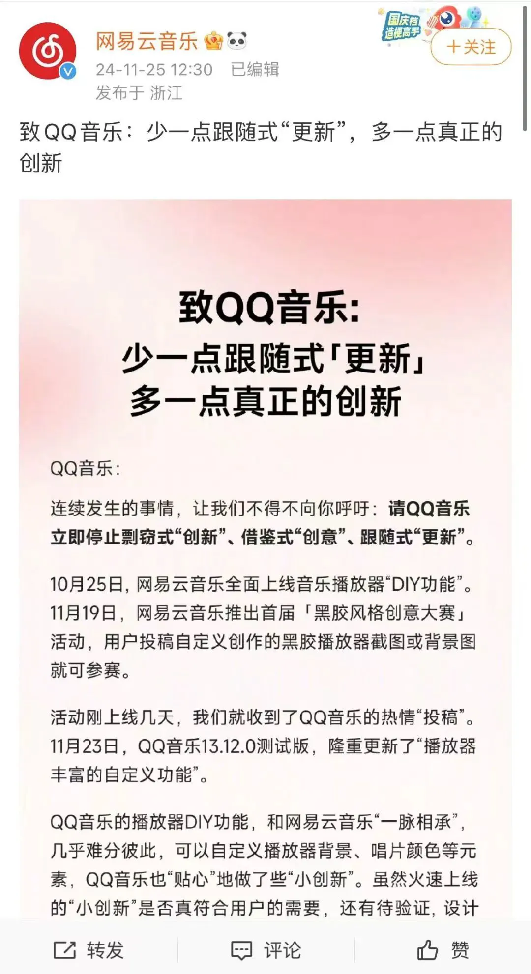 大概就是,网易云细数了 QQ 音乐 “ 抄袭 ” 他们家产品的几大罪状,比如 QQ 音乐抄了他们家的播放器 diy 功能、黑胶播放界面,就连 “ 音乐房间 ” 功能也是抄网易云的 “ 一起听 ” 。。。