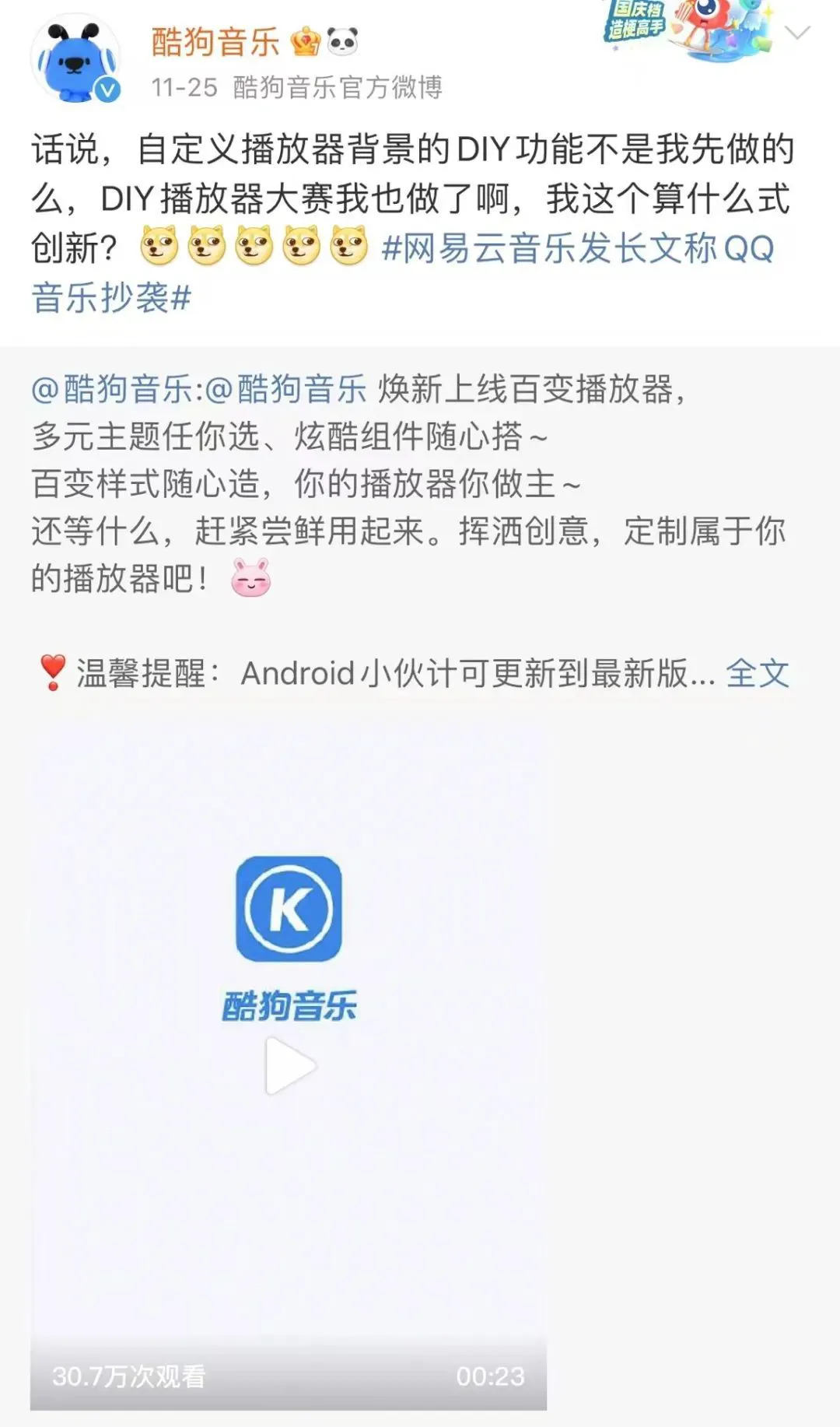 然后酷狗音乐站出来替自家兄弟反击,转发了一条自己去年 10 月份的微博,一句“ 我这个算什么式创新? ”,直接硬刚网易云。
