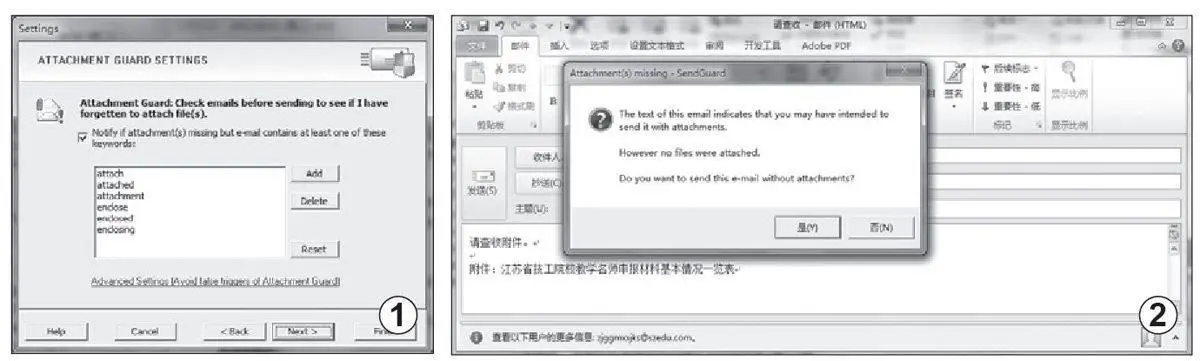 以后,当老程使用Outlook发送邮件时,如果邮件正文包含附件内容,例如“附件:江苏省技工院校教学名师申报材料基本情况一览表”,但最终却没有添加“江苏省技工院校教学名师申报材料基本情况一览表”这个附件文件,那么SendGuard会自动弹出提示框(如图2),提示用户添加附件文件,这样老程就不用担心误事了。