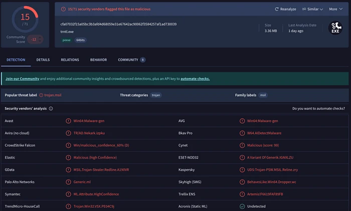 (https://www.virustotal.com/gui/file/cfa07032f15a05bc3b3afd4d68059e31e67642ac90062f3584257af1ad730039/detection)
