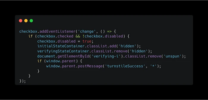 在index_1.html中,该代码监控复选框。一旦受害者与之交互,页面就会向父页面发送turnstileSuccess消息。