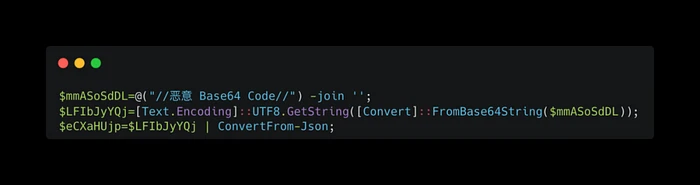 恶意PowerShell脚本通过将其连接成一个字符串、从Base64解码并将其转换为JSON对象来处理数组$mmASoSdDL。