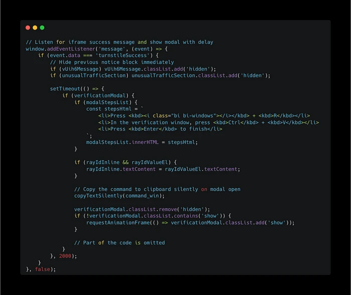 前端代码显示,该程序侦听来自iframes或父/子窗口的postMessage事件。一旦收到消息turnstileSuccess,它就会调用函数copyTextSilently()。