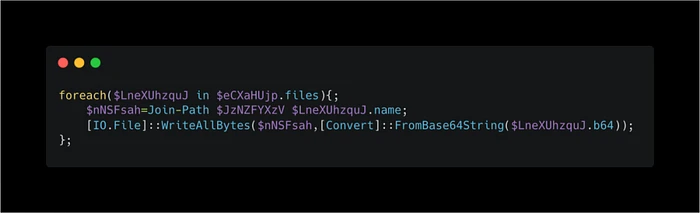 脚本迭代JSON中的files数组,构造完整路径,解码Base64编码的二进制数据,并将它们写入隐藏目录。