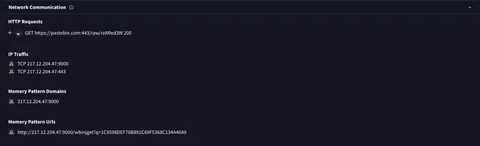 恶意软件从Pastebin检索其 C2配置,并与恶意IP 217[.]12[.]204[.]47:9000/443建立通信。这允许窃取数据的泄露和命令的接收。