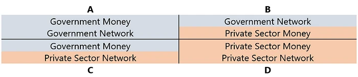 货币和支付网络可以是公共的或私人的。在此上下文中,“公共”指的是政府、中央银行和其他公共部门机构,而“私人”指的是私有和运营的实体,例如大多数商业银行、信用卡公司和其他金融服务提供商。实际上,两者之间的界限并不像下面理想化的象限那样明确,因为政府发行的公共货币在私人网络中流通,而且大部分私人金融部门都受到公共机构的严格监管。但是,公私区分是思考新兴货币形式和支付系统如何与现状相关的一个良好起点。
