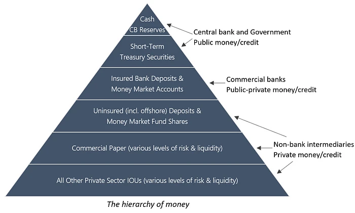 在第二种情况下,与国家货币相关的货币也可以采取更“公共”和更“私人”的形式。这可以用经典的货币层次结构来说明,其中可接受性和流动性从上到下递减:最普遍接受和最具流动性的(公共)货币形式位于层次结构的顶部,而最狭隘接受和流动性最差的(私人)货币形式位于底部。虽然可能存在区域和历史差异,但下图大致反映了大多数现代经济体的现状,在这些经济体中,发行货币的权利仅限于中央银行,而与该货币相关的货币单位被商业银行、非银行金融中介机构和整个私营部门广泛使用,以不同程度地被视为现金等价物的信贷和证券进行计价。