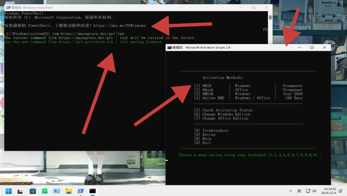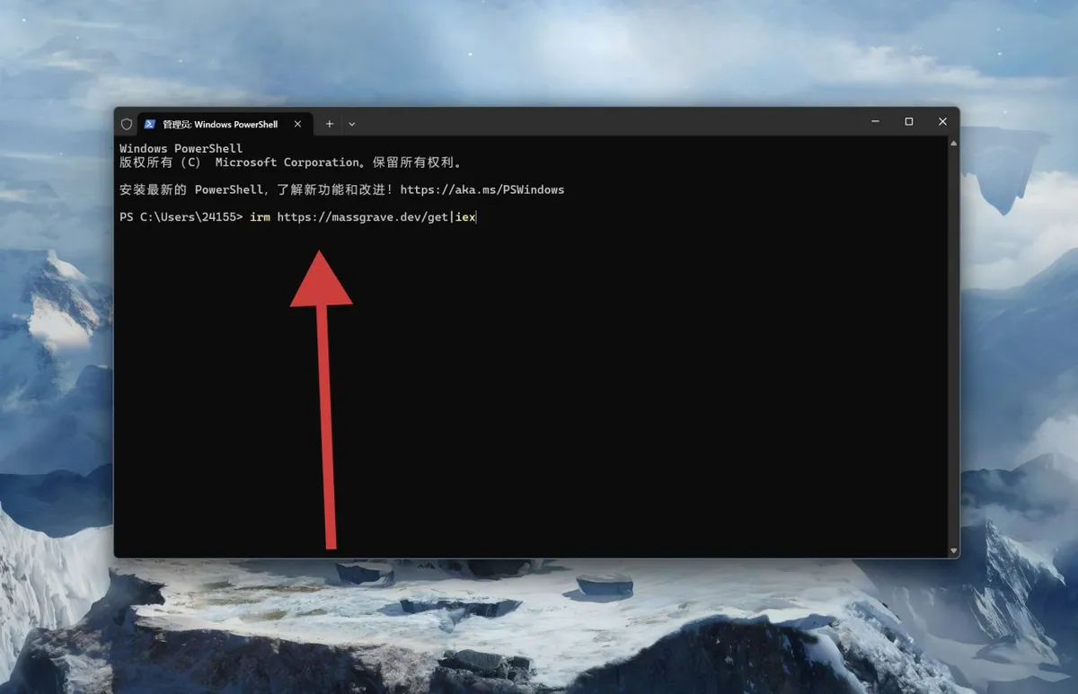 2.打开Windows PowerShell后,在命令框输入:irm https://massgrave.dev/getliex/,按回车进行运行程序。