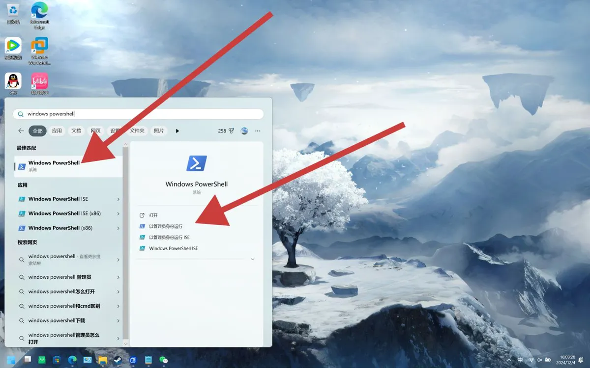 1.在开始菜单搜索Windows PowerShell,并以管理员身份运行:Windows PowerShell