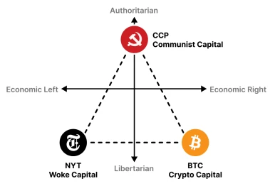 接下来,我们获得了 Balaji 对最近历史中的政治重组的概述,最后我们进入了他当前时代政治核心的模型:NYT、CCP、BTC。