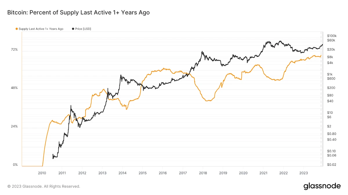 报告发现,约 66% 的流通 Bitcoin 供应,即 1226 万 BTC,在过去一年中完全闲置,未有任何链上交易。这表明大量 BTC 是长期持有的,但不产生任何收益。