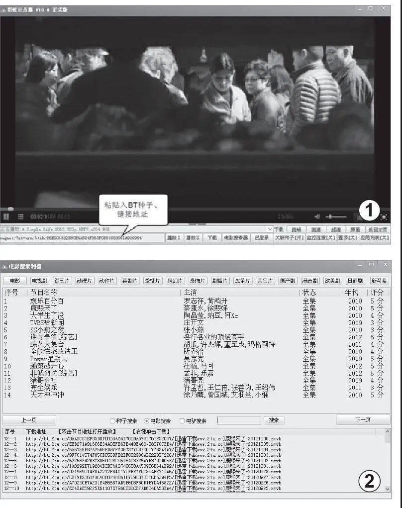 用该软件搜索、下载电影也非常方便,单击“电影搜索器”打开搜索窗口,在这里既可以从分类中查找影片,也可以选择“电影搜索”或“电驴搜索”(普通用户无法使用“种子搜索”),然后输入影片名称,单击“搜索”来进行查找,查找到的视频播放地址显示于下方列表中(如图2),双击地址可直接播放。如果右击地址的话,则会调用迅雷进行下载。