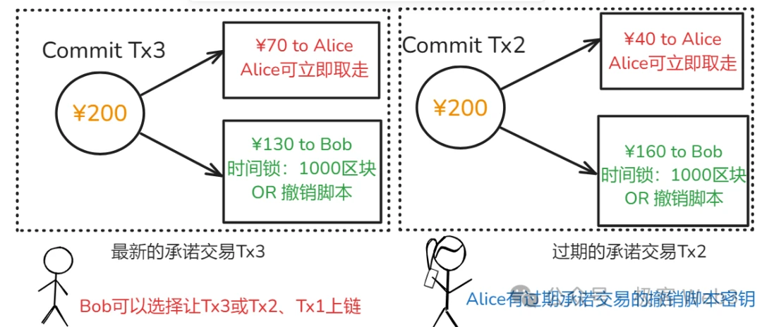 我们看下面这张图,假设最新的承诺交易是Commit Tx3,Commit Tx2过期,如果Bob把过期的Tx2提交到链上,Alice可以通过Tx2的撤销密钥把Bob的钱抽走(Alice要赶在时间锁范围内行动)。