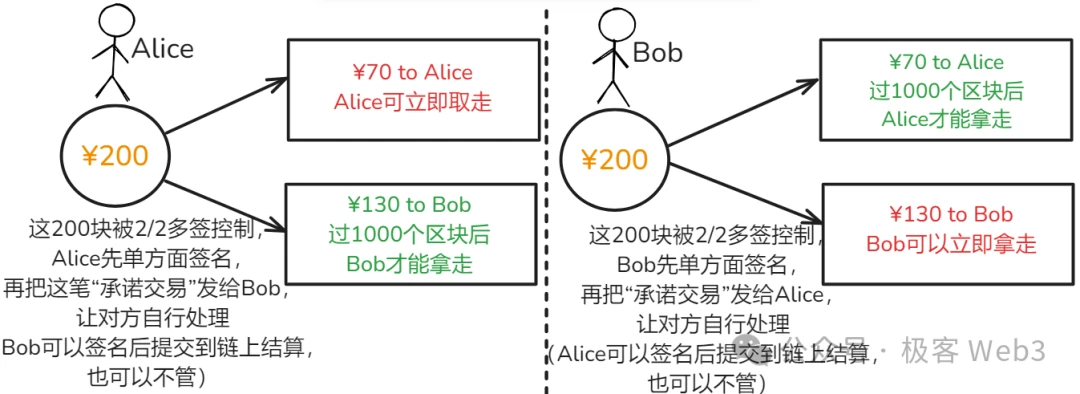 前面我们解释过, 每笔承诺交易都要2/2多签才能生效, Bob本地构造的、对自己有利的承诺交易不满足2/2多签,而满足2/2多签的承诺交易扣在Alice手上,Bob没法提交,只能由Alice提交,这就形成了制衡。反过来也是类似的道理。