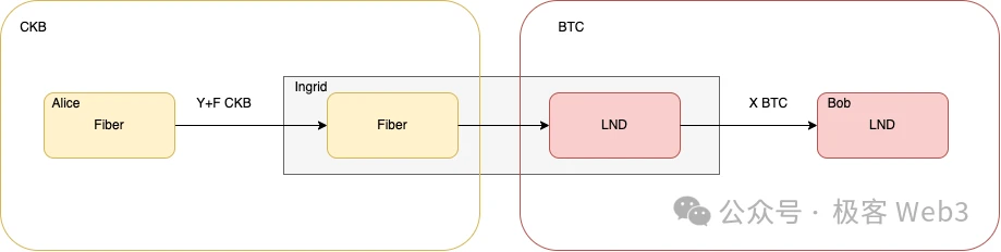 我们简单说下原理:假设Alice在Fiber网络内运行了节点,而Bob在比特币闪电网络中运行节点, Alice想向Bob转账一些钱,它可以通过跨域中转商Ingrid实现这笔转账。Ingrid会分别在Fiber和BTC闪电网络内运行节点,充当转账路径中的中间人。