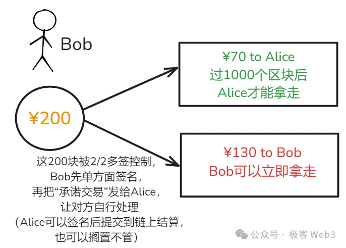 这里我们要注意: 这笔承诺交易是Bob主动构造的,其中条件对Alice不利,Alice只能接受/拒绝,我们要想办法留给Alice一些自主权。 在支付通道的设计中,只有Alice自己能把“对自己不利”的承诺交易放到链上触发,这是因为承诺交易要凑足2/2多签,Bob在本地构造交易后只有自己的签名,没有Alice签名。