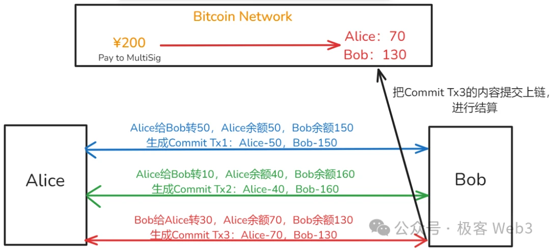 假设Alice和Bob共同开启了一个通道,他们先在链上构建多签账户,向里面存一些钱,比如Alice和Bob各存入100块,作为在链下通道中各自的余额。 接下来双方可以在通道里进行多笔转账,等退出通道时,再把最终的余额同步到链上,由多签账户给双方打款,即“结算”。