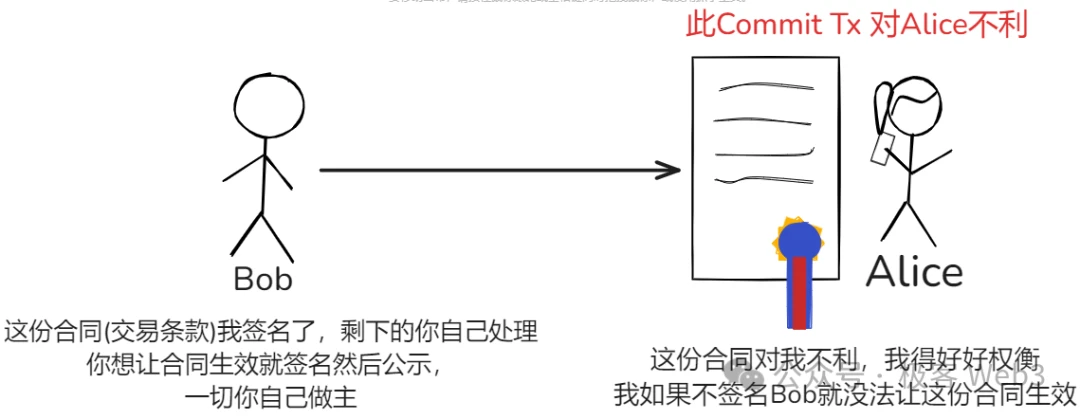 而Alice可以“只接收Bob的签名,但不把自己的签名发给他”, 这就好比一份对你不利的合同,需要你和别人双签,对方先签名后把文件给你,你可以不让对方拿到签名。 你想让合同生效就签名然后公示,不想生效就不签名或不公示。显然在上面的案例中,Alice有办法限制Bob。