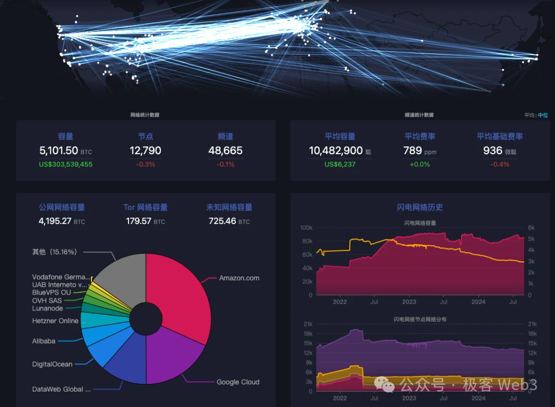 如果CKB官方的愿景得以在未来实现,无论对闪电网络还是对CKB乃至比特币生态而言,都将是巨大的利好。 根据mempool的数据,当前BTC闪电网络中安置了3亿多美元的资金,节点数量约为1.2万个,彼此之间构建了近5万条支付通道。