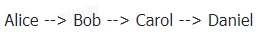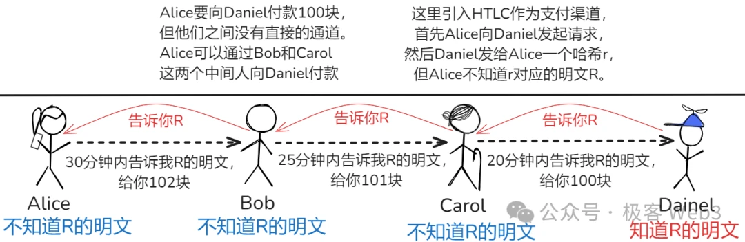 假设Alice要向Daniel付款100块,但他们之间没有建立通道。而Alice发现,可以通过Bob和Carol这两个中间人向Daniel付款。这里面要引入HTLC作为支付渠道, 首先Alice向Daniel发起请求,然后Daniel发给Alice一个哈希r,但Alice不知道r对应的明文R。