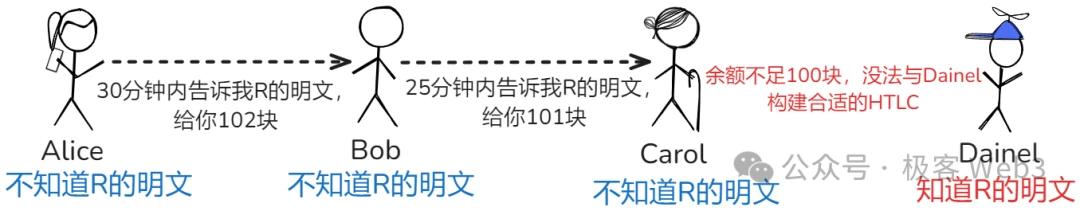 之后的事情不难想象:Carol把密钥R告诉Bob,拿到101块钱;Bob再把密钥R告诉Alice,拿到102块钱。 我们观测所有人的得失,可以看出Alice失去102块钱,Bob和Carol净赚1块钱,Daniel得到100块。这里面Bob和Carol赚的1块钱就是它们从Alice那抽的手续费。