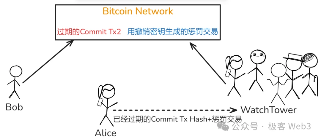 具体的解释如下:对于每笔过期的承诺交易,Alice或Bob可以事先把对应的惩罚交易构造好(用撤销密钥处理过期的承诺交易,受益人声明为自己),然后把惩罚交易的明文发给WatchTower。一旦WatchTower监测到有人把过期的承诺交易提交上链,它就会把惩罚交易也提交上链,进行针对性的惩罚。