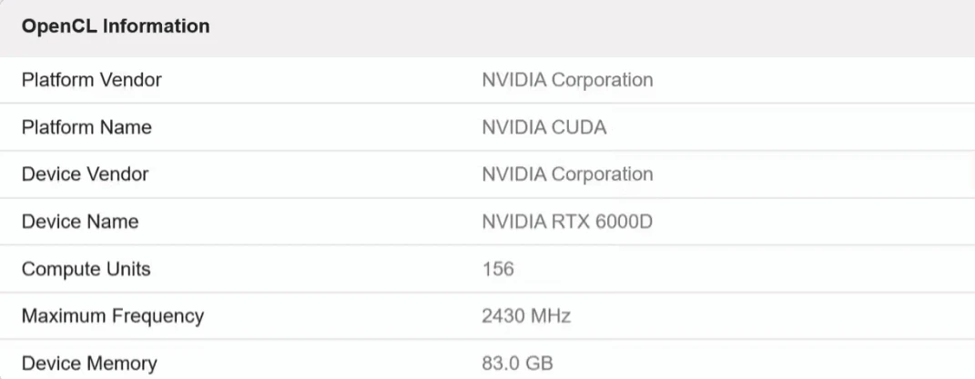 Geekbench基准测试数据库中出现名为“RTX 6000D”的显卡数据。该显卡计算单元数量为156个,对应英伟达显卡中的SM(流式多处理器)数量。测试数据显示其显存容量为83.0GB,预计实际硬件配置为84GB,运行频率为2430MHz。