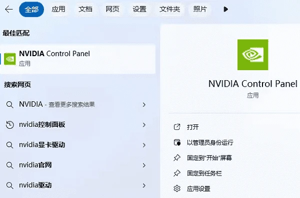 - 点击开始菜单,在搜索框中输入“NVIDIA控制面板”,然后点击搜索结果中的“NVIDIA控制面板”图标。