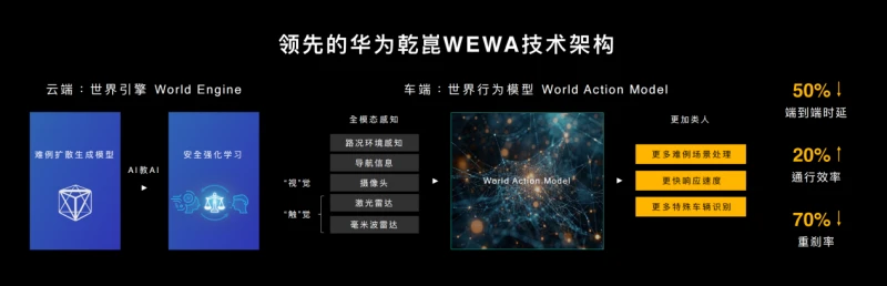 我们有必要先来解析一番尚界H5所搭载的华为乾崑智驾ADS 4。其采用全新的WEWA架构,由云端的世界引擎和车端的世界行为模型组成,实现了以“AI训练AI”的方式解决行业普遍存在的长尾难题,例如鬼探头、前车急刹等。同时相比上一代架构,系统延时更低,响应更快,变道更丝滑,无效变道次数减少,重刹率显著降低。
