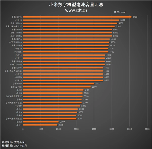 可以看到,进入2024年,可以发现手机厂商所发布的新款机型的电池容量呈逐渐走高的趋势,小米数字系列手机也同样逐步增加电池容量,虽无其他手机厂商更大,例如红魔游戏手机一度达到7050mAh,但相较于上代同款机型已有超1000mAh的跨度,用户出行续航时间将更为长久。