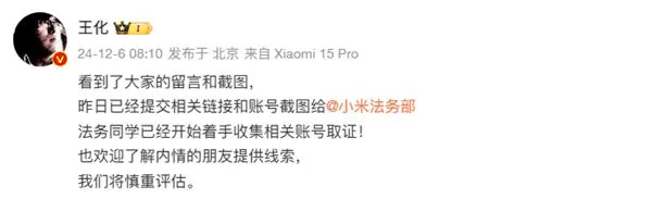王化表示昨天就已经提交相关链接和账号截图给小米法务部,目前法务部已经开始着手搜集相关账号取证,欢迎了解内情的朋友提供线索,将慎重评估。