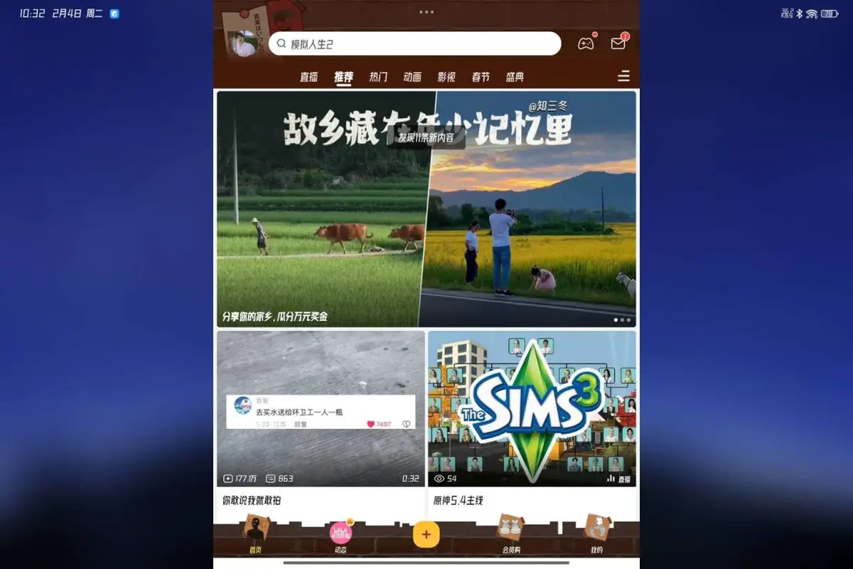 系统到目前有几次退出动画卡顿,说实话这个平板的优化和 iPad 比差了不止一点点,哔哩哔哩没有专门的优化,横屏只能显示一点,QQ音乐更不用说了,手机端根本用不了,最后下了一个车机版解决了