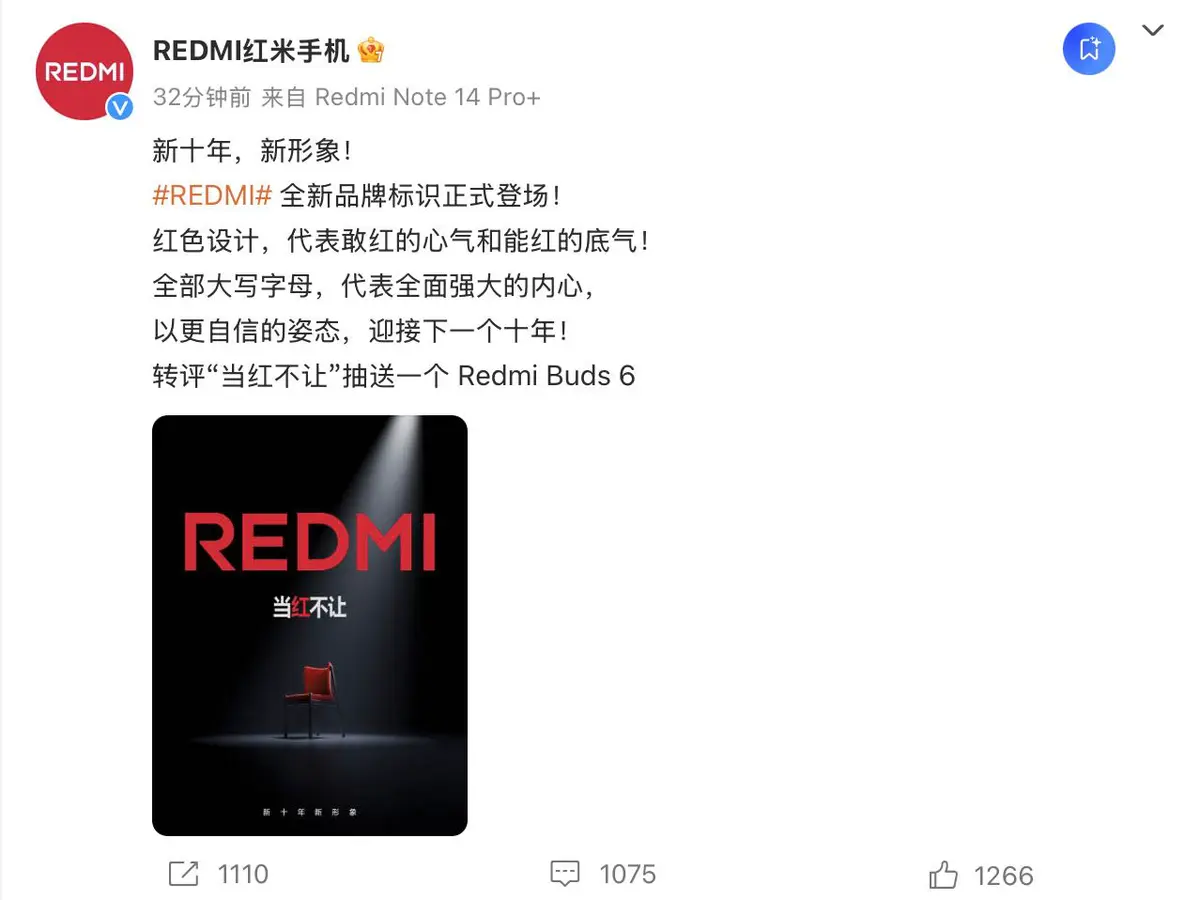 值得一提的是,11月中旬,小米旗下Redmi红米手机公众号已经更名为「REDMI红米手机」,现在,其官方微博也已经采用了全新的品牌标识。