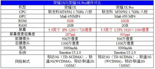 从硬件配置对比中可以看出,此次荣耀3X Pro升级主要体现在RAM与屏幕上,上一代720P的分辨率在荣耀3X Pro中升级到了1080P,屏幕技术也由IPS改成了LTPS。RAM也由荣耀3X上的8GB提升到了16GB。除此之外,荣耀3X Pro在其他地方均没有明显硬件升级。