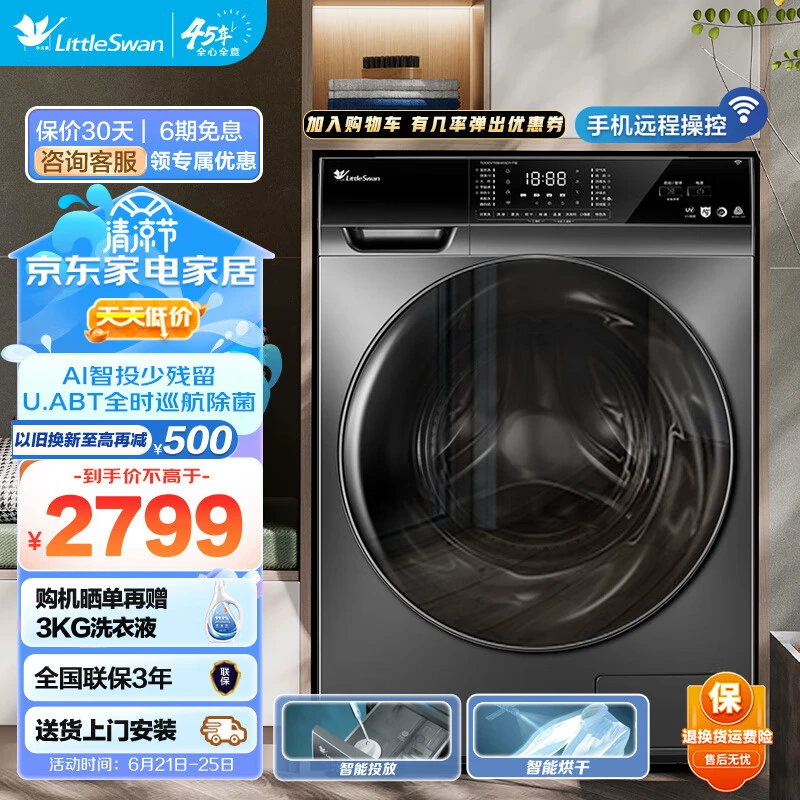 综上所述,小天鹅新品10公斤洗烘一体机凭借其大容量设计、智能投放与除菌功能、出色的烘干效果、高效节能以及人性化设计等特点,成为了家庭中的理想选择。无论是对于忙碌的都市白领,还是对于注重生活品质的家庭主妇来说,它都是一个不可多得的好帮手。