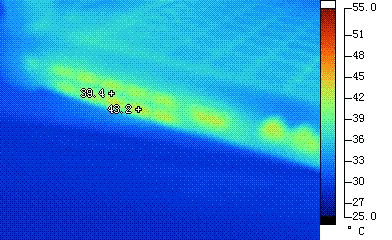 三星R25产品背面温度明显不均,靠近左侧的部分温度较高,不太适合用户放在膝上操作。处理器出风口测试温度为43.2度,温度控制还算不错。