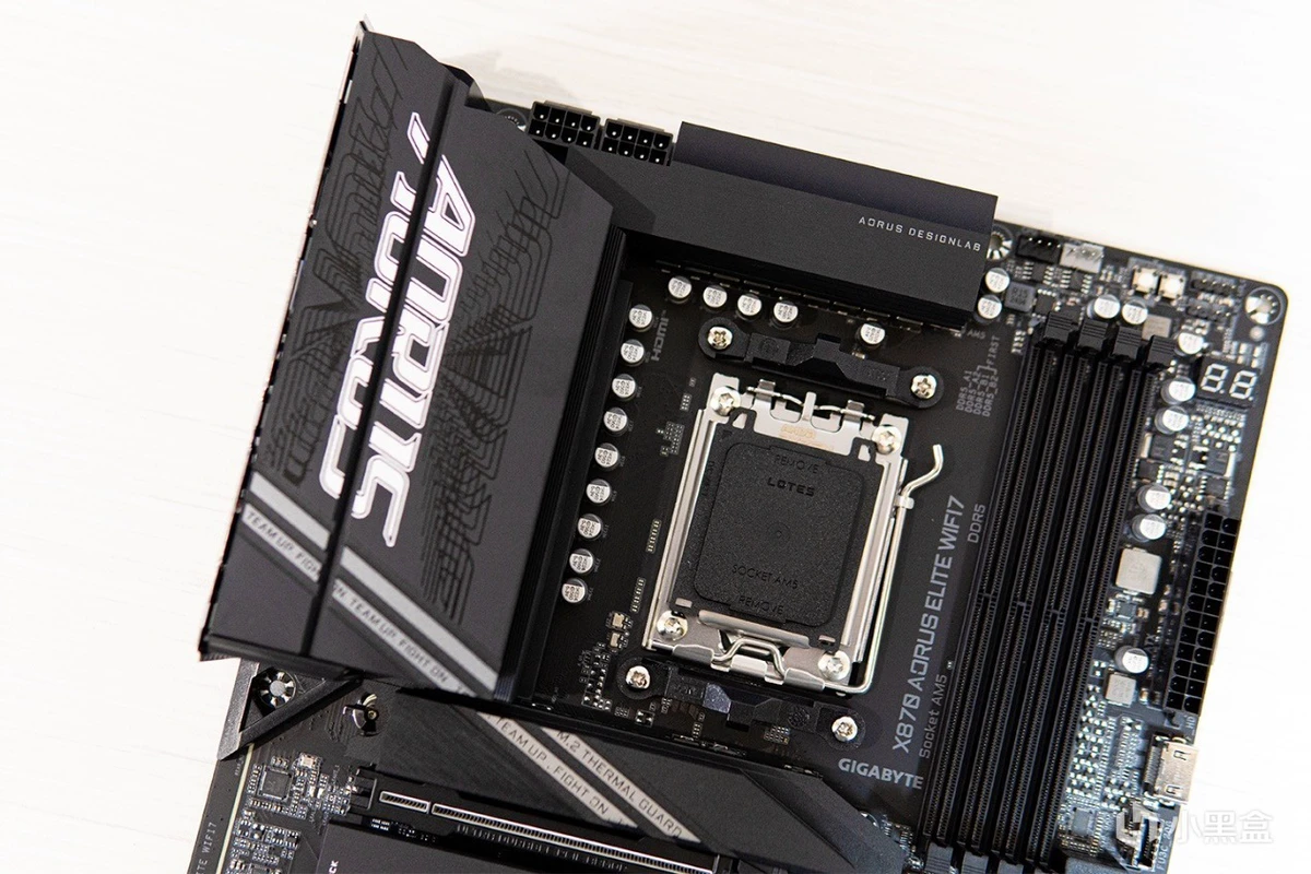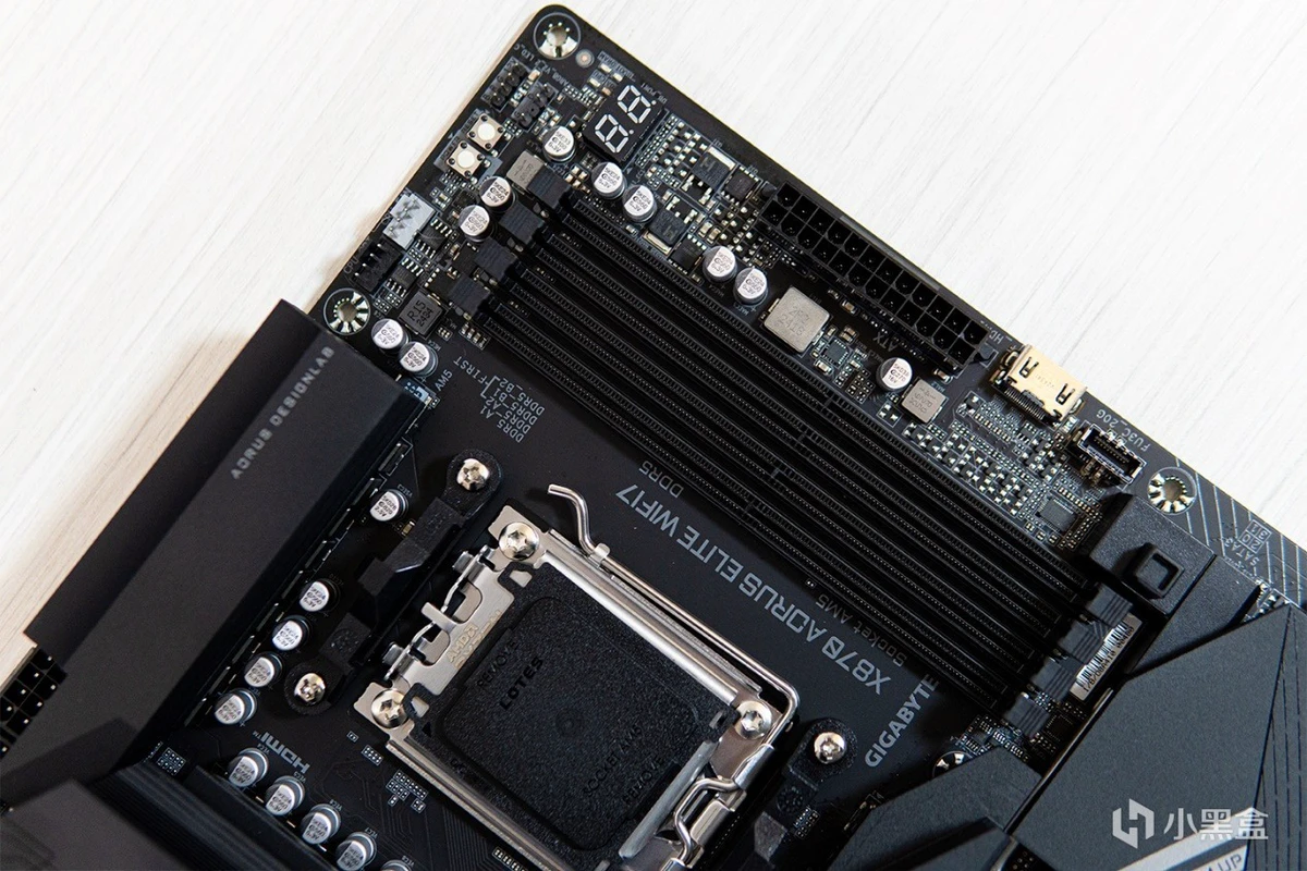 技嘉X870 AORUS ELITE为黑色主板,装甲带白色涂装点缀,磨砂工艺处理,装机过程中不会沾染指纹,主板整体设计比较简约干练,颜值不错。