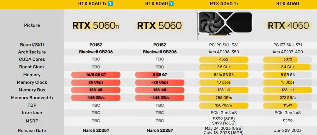 目前,GeForce RTX 5060(/Ti)的完整参数尚未公布,但部分关键规格已经曝光。RTX 5060依然采用128-bit位宽,并搭载8GB GDDR6显存,而RTX 5060 Ti则提供两种显存配置:8GB和16GB版本。从架构上来看,新一代显卡预计仍然基于Ada Lovelace架构,但在CUDA核心数量和频率方面可能会有所调整,以提升整体性能。