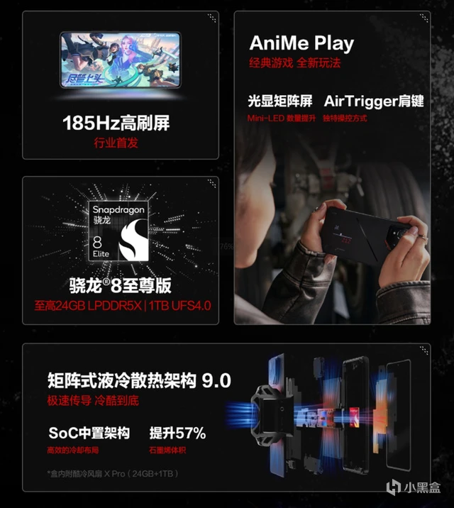为了确保骁龙8至尊版在长时间高负荷运行下保持最佳性能状态,ROG 9系列配备了全新的矩阵式液冷散热架构9.0。该架构采用SoC中置五段式架构设计,有效避免了玩家手持部位过热的问题,内部加入了超大石墨烯材质,体积提升57%,能够快速将SoC产生的热量传导至整个背面,配合氮化硼和导热铜柱,形成高效的散热通道,有效避免了热量堆积,保证了手机在长时间游玩高画质游戏时也能时刻保持满帧运行。