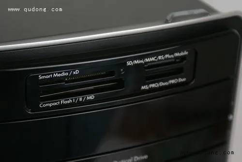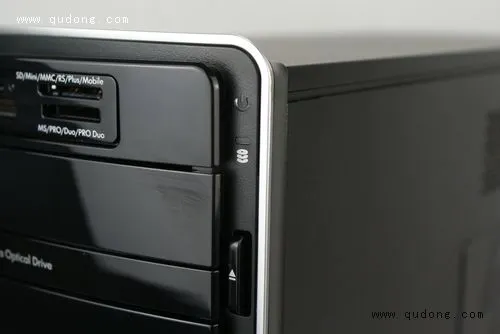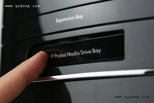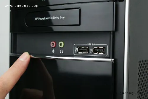 我们首先来看看主机的前面板。在机箱的顶端我们可以看到电源键被安置在了最容易按的位置,这对于常把主机放在桌下的用户们非常方便,省去了弯腰下蹲的麻烦。与之间的S系列主机不同的是P6235CN采用了整体立式设计,所以光驱位是采用横置,这样宽度也有所增加,但是使用起来要比竖置的光驱托盘好用的多。在光驱位置之上是众多台式PC中非常少见的配置,15合1的读卡器,该读卡器可以兼容目前市面上各种接口的存储卡,这比S5235CN的读卡器功能来的更加全面。譬如经常摄影的用户比较常用到CF卡,而P6235CN可以一个不落的完美兼容。在读卡器的右边,我们可以看到P6235CN主机工作指示灯,除了电源外,还有硬盘工作指示灯,这个不可少的配置在我们日常使用中非常实用。在光驱位置下面是HP专门为其旗下移动存储设备所预留的专用接槽,惠普将其命名为HP Pocket Media Driver Bay,通过它可以实现与惠普移动存储设备的热插拔连接。看到这里或许您会有点纳闷,因为可能您会发现少了点什么东西,没错那就是我们常用的前置USB接口和音频输入输出。其实P6235CN的奥秘就在这里,我们将带有HP logo的面板轻轻向下一推,我们就能看到它们了,这样做即可以防止灰尘影响接口的接触程度,又能美观前面板,可谓非常独到的设计。