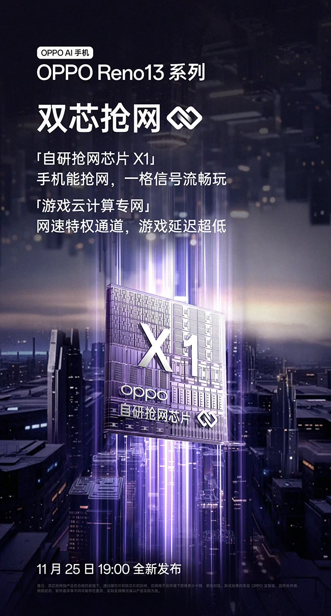 作为 OPPO 首个抢网手机,Reno13 系列搭载了独家定制的自研抢网芯片 X1,更大的发射功率将大幅提升手机连接 Wi-Fi 条件下的上下行能力,在实际应用场景中,能做到不怕远、不怕挤、不怕墙,真正「一格信号也流畅」。