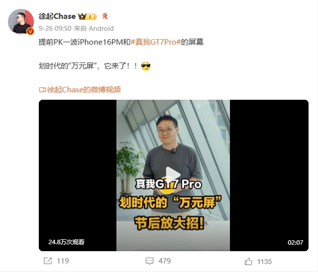 而在真我这边,@徐起Chase 也是在屏幕上进行了宣传,直接与iPhone 16PM进行了一波对比,并且提到了是一款划时代的“万元屏”,不过目前还没有该屏幕的具体信息,但效果应该有着很多提升。