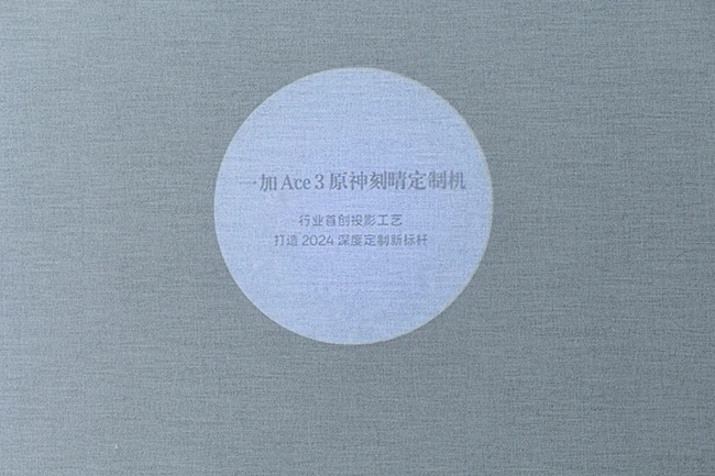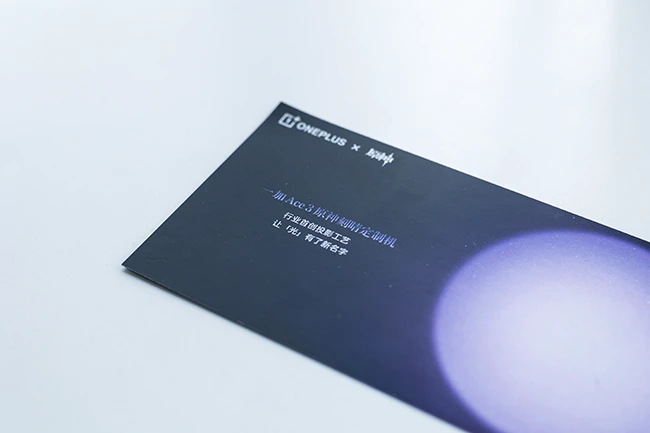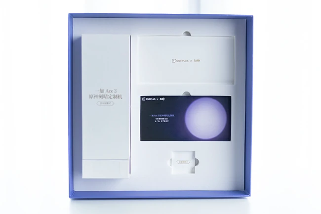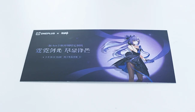 盒子右上方的信封便是邀请函,上面写着一加Ace 3刻晴定制机线上发布会的时间为2月28日19:00。邀请函下面有两张卡片,其中一张卡片上写着,这款机型采用“行业首创投影工艺,让光有了新名字”,这预计和新机的设计有很大关系。