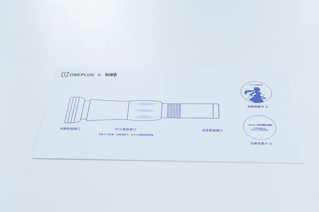 一加Ace 3刻晴定制机包装里有一个特殊的定制投影灯,而另一张卡片上写的便是投影灯的使用方法。投影灯和我们日常使用的手电筒非常像,它提供了两个投影片,其中一个刻晴角色的剪影,游戏氛围感瞬间拉满。另一个投影片依旧强调的是新机的工艺,上面写着“行业首创投影工艺,打造2024深度定制新标杆”。从目前的邀请函里的内容来看,一加Ace 3刻晴定制机的定制程度应该会相当深度,预计会受到众多《原神》资深的玩家喜爱。