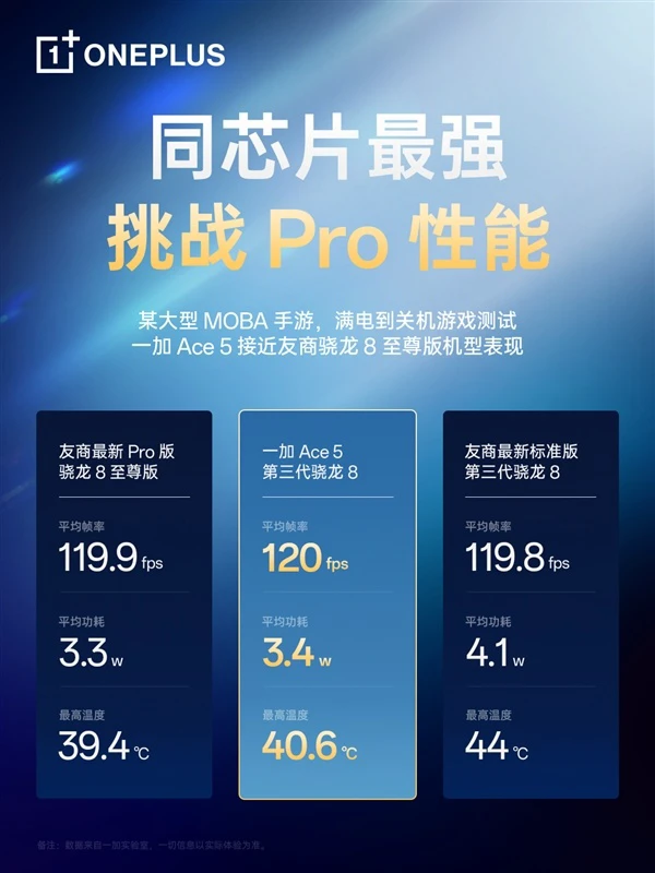 数据显示,同样运行某大型MOBA手游,从满电到关机,一加Ace 5的平均帧率是120fps,平均功耗3.4W,最高温度40.6℃。